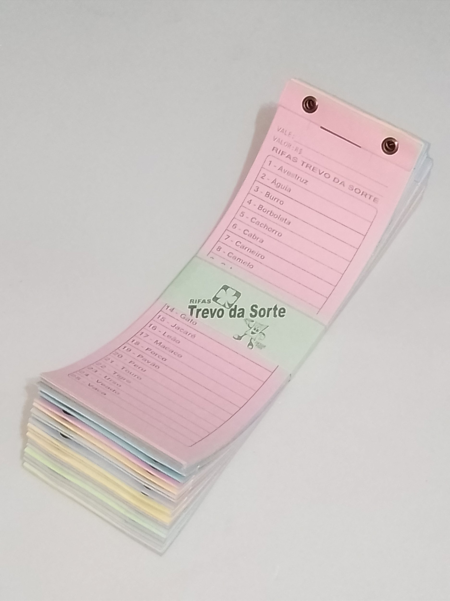 As rifas são impressas em quatro cores em cartolina escolar 140g